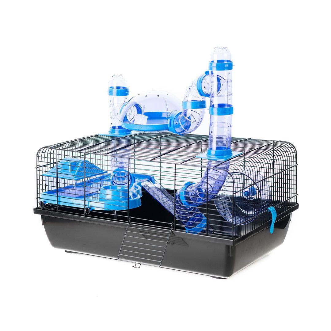 Deze Jerry kooi met panorama van Duvo+ is een kwalitatieve kooi met inclusief loopradje en trapje. De ideale behuizing voor uw hamster. Deze kooi heeft extra tunnels die uit de kooi komen en een koepel waar uw hamster kan genieten van een 360graden panorama. De bovenkant is afneembaar waardoor u te kooi gemakkelijk kan kuisen.