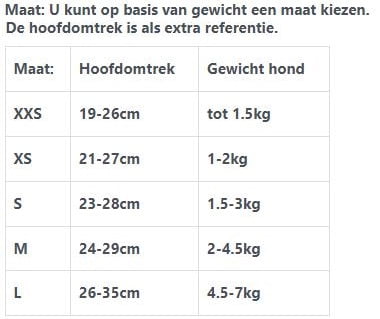 | Maat: | Hoofdomtrek | Gewicht hond |
