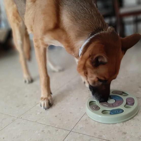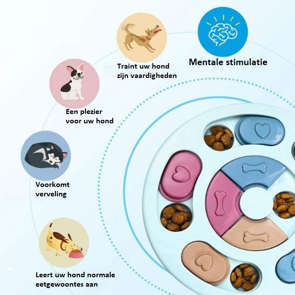 Interactieve voerpuzzel voor honden. Deze puzzel anti-schrokbak maakt het eten leuk, en traint uw hond om te werken voor zijn eten, en voorkomt dat hij te snel eet en gaat stouwen of stikken. Deze minder snelle eetwijze voorkomt gezondheidsklachten waaronder overgewicht en maagproblemen.