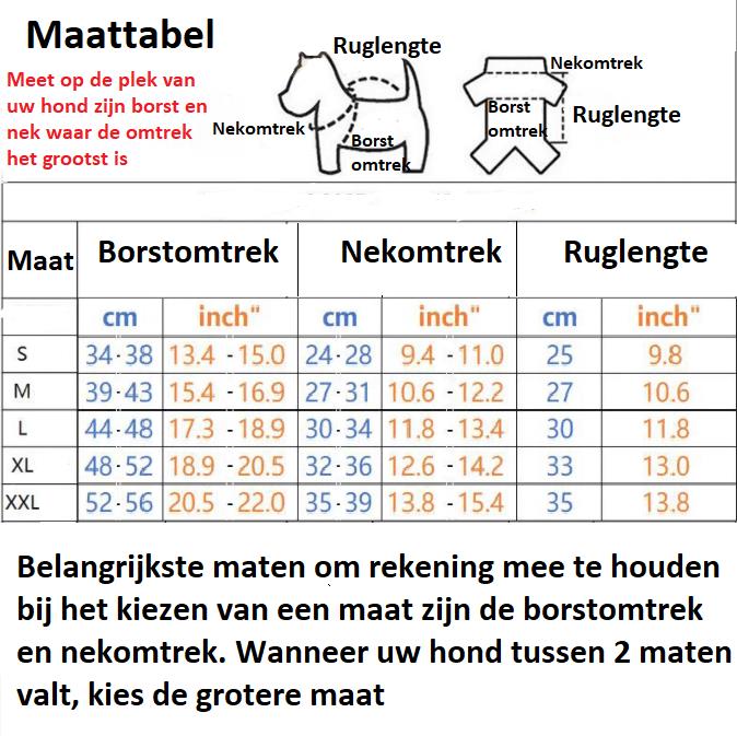 Maat kiezen: Valt uw hond tussen 2 maten, kies de grotere maat. De belangrijkste maten om rekening mee te houden zijn de ruglengte en borstomtrek.