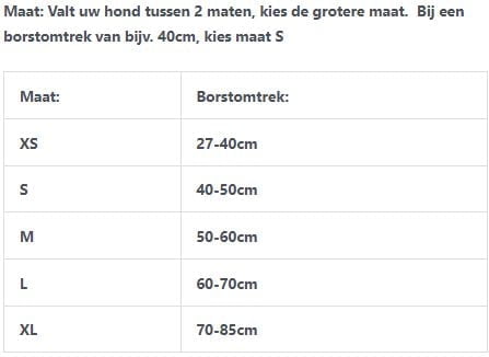Maat: Valt uw hond tussen 2 maten, kies de grotere maat. Bij een borstomtrek van bijv. 40cm, kies maat S